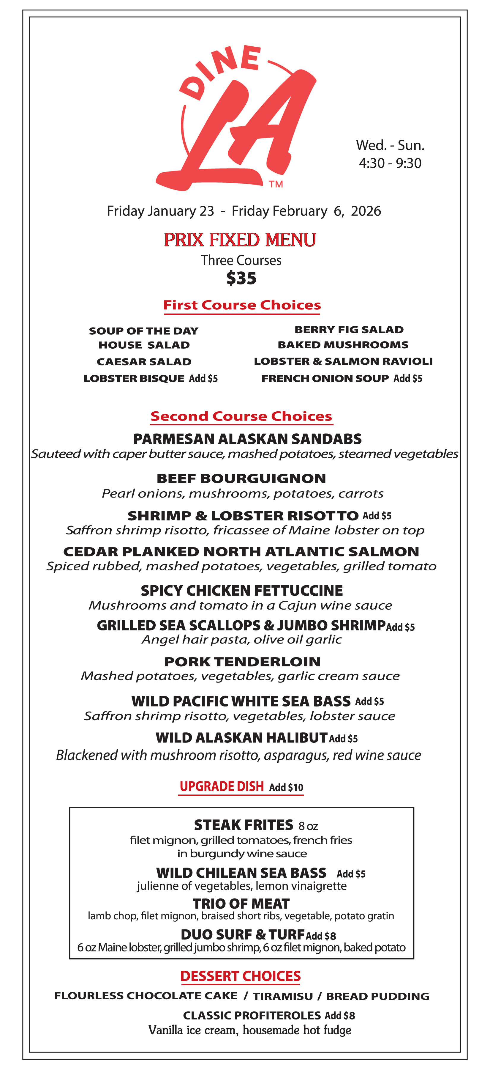 6 oz Maine lobster, grilled jumbo shrimp, 6 oz filet mignon, baked potato